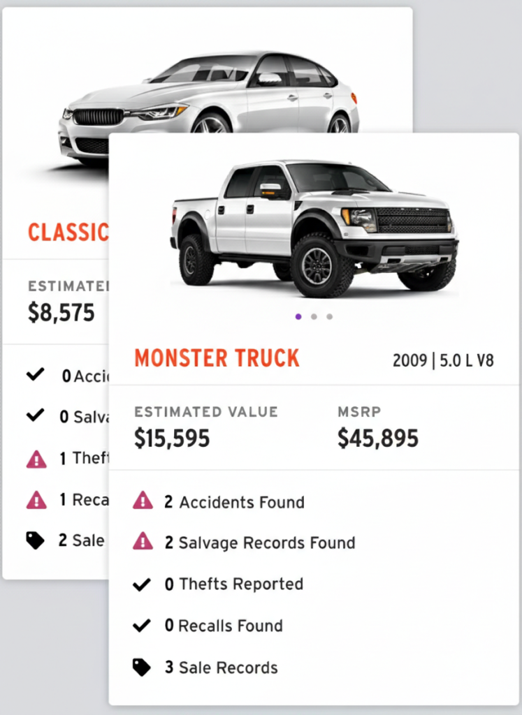 Check a car’s accident, salvage, or theft records using the VIN or license plate.